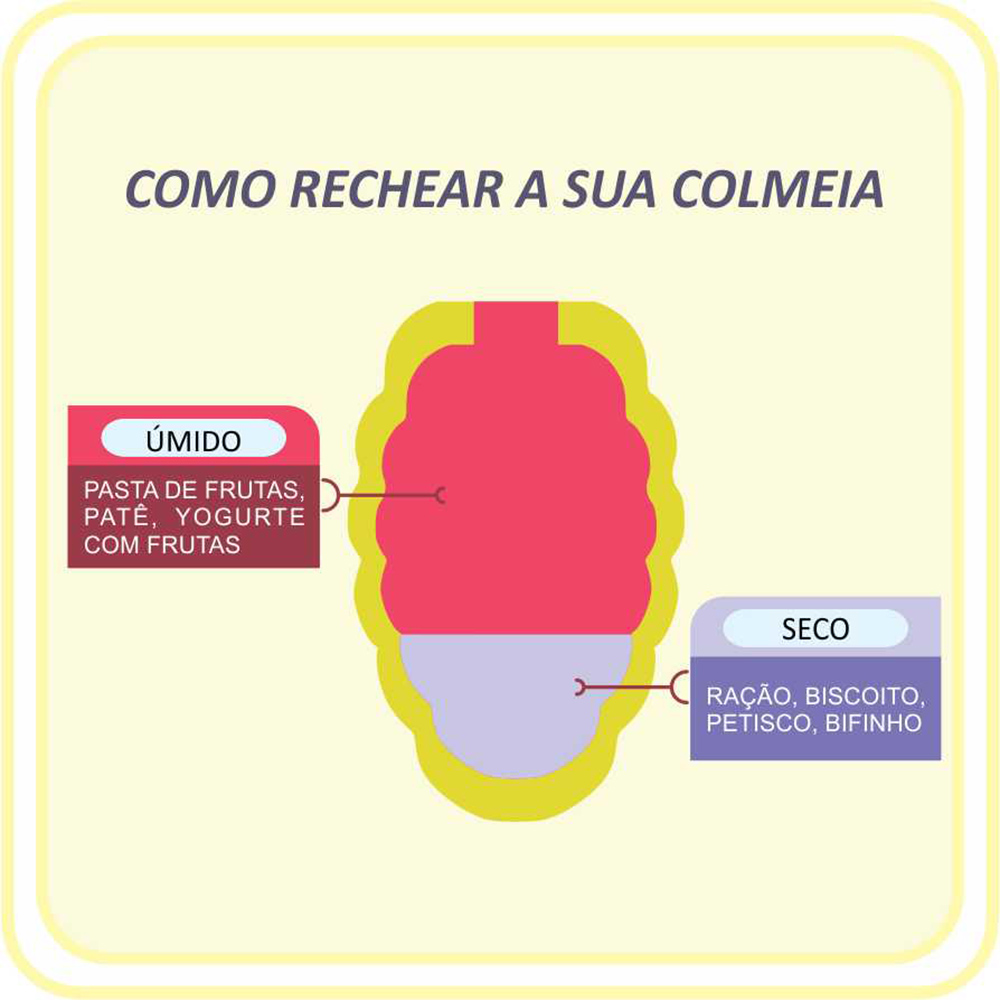 Se decidir utilizar alimentos secos a dica é colocar este alimento no fundo da Colmeia e depois cobrir com a pasta úmida, assim a ração só sairá no final da brincadeira. (veja na imagem abaixo)
